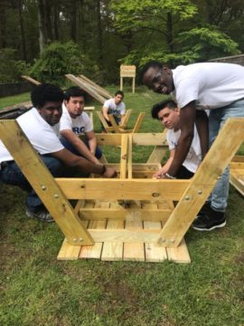Nassau BOCES and AHRC Nassau Day Hab participants add finish to a picnic table.