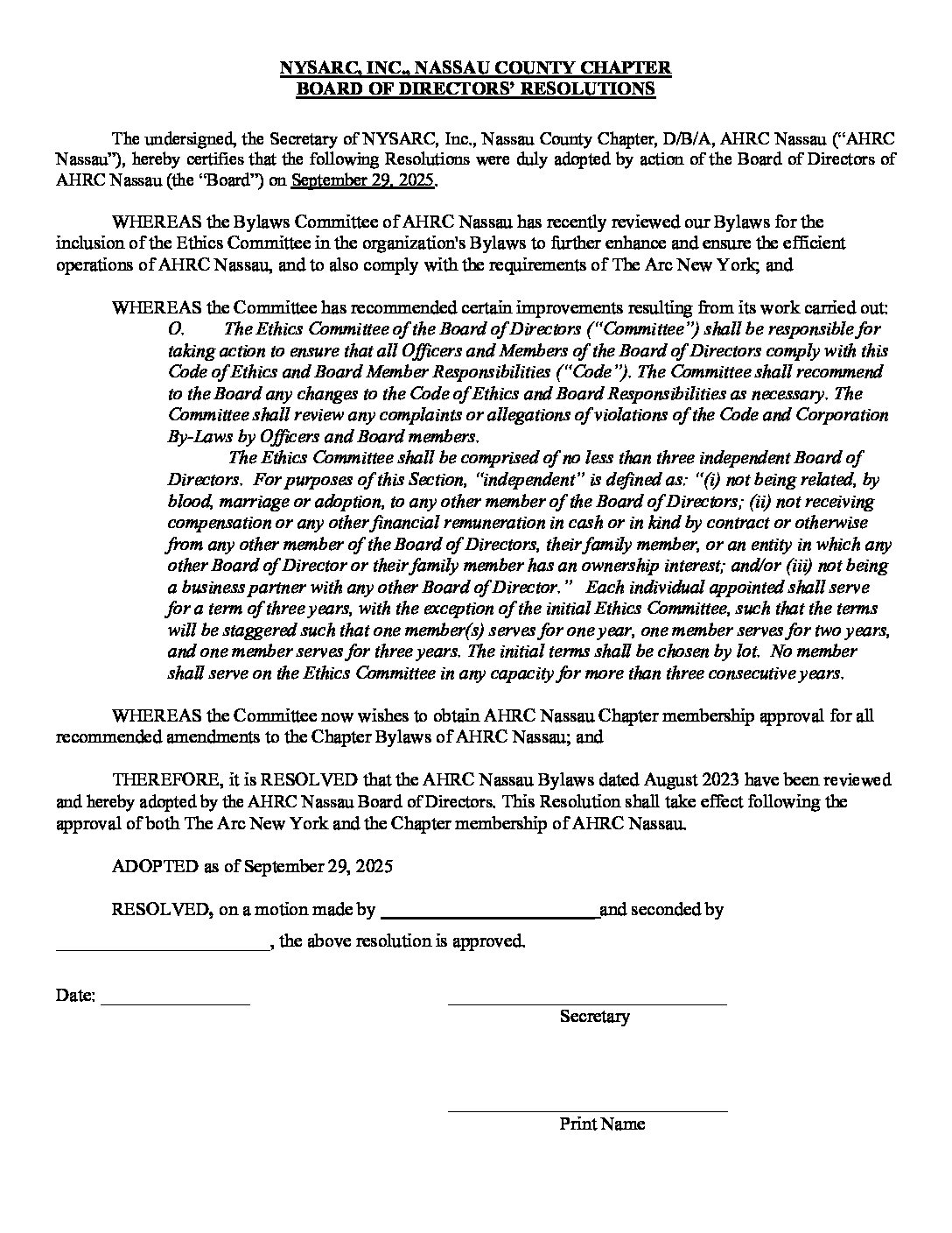 Resolution for Inclusion of Ethics Committee to the NYSARC Nassau Bylaws by Membership